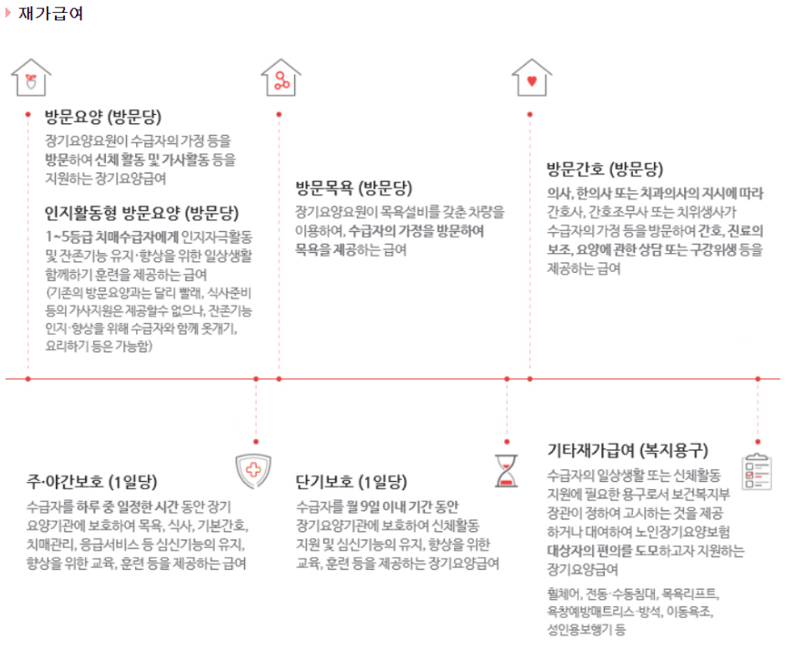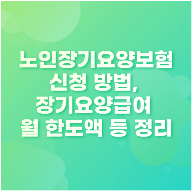 그래서 오늘 포스팅에서는 노인장기요양보험과 관련된 각종 용어 설명과 더불어서 장기요양급여를 신청하는 방법과 신청 자격, 그리고 장기요양인정 대상자로 선정되었을 경우 장기요양급여를 얼마나 지원받을 수 있는지(월 한도액과 급여비용 등)에 대해서 최대한 친절하게 설명해 드리고자 합니다.