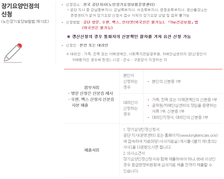 장기요양급여를 받기 위해서는 바로 이 '장기요양인정'을 먼저 신청해야 합니다.